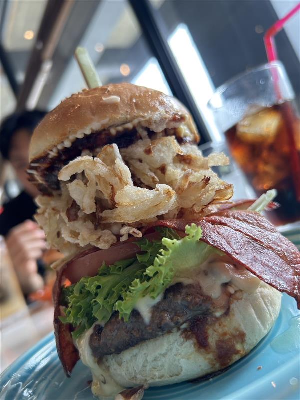 1枚目の写真は、有名なハンバーガー屋さんの特大ハンバーグです!手のひらより大きいサイズで、食べるとき顎が外れてしまいそうでした。味は、本場のアメリカを感じるワイルドな味でした!!