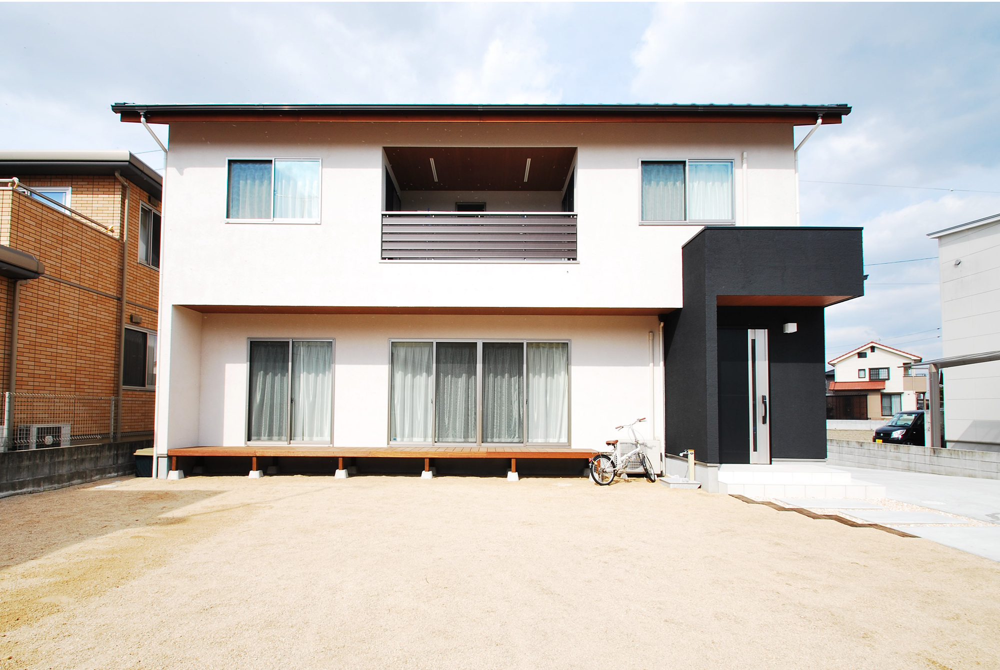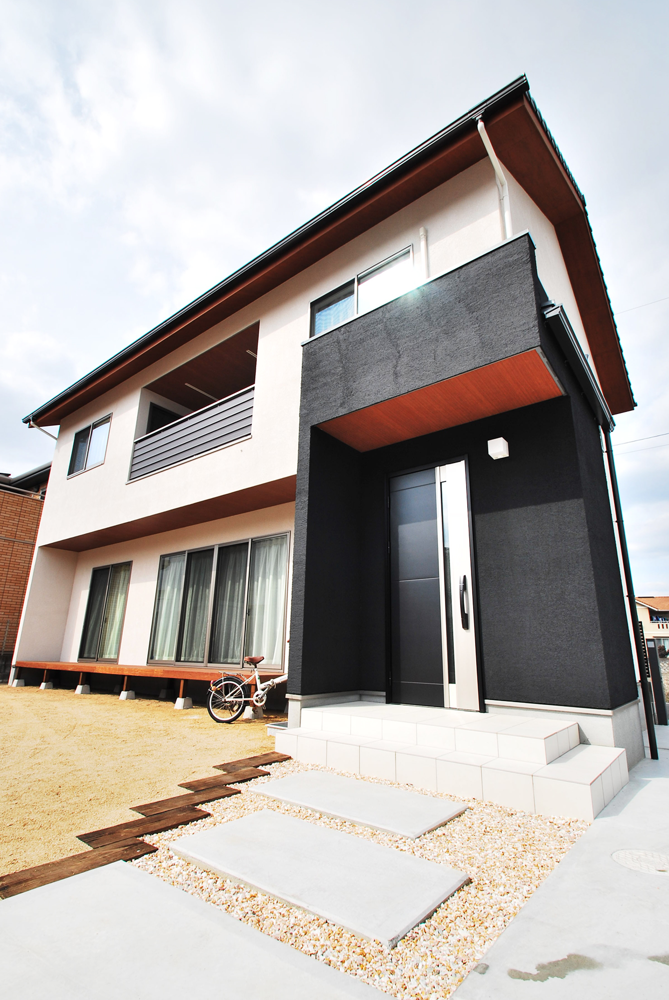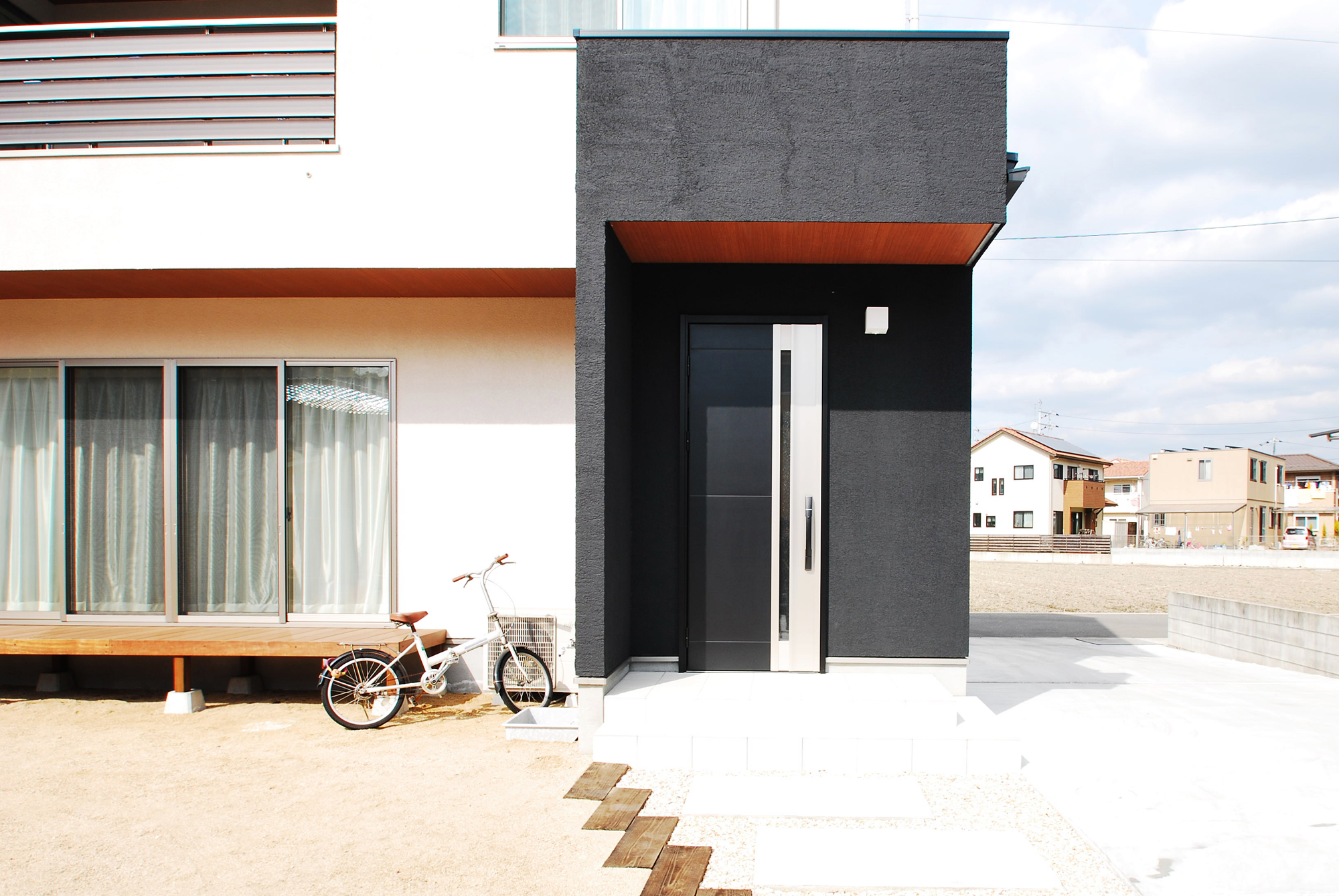 モノトーンにナチュラルな木目が演出するオシャレな外観のO様邸。