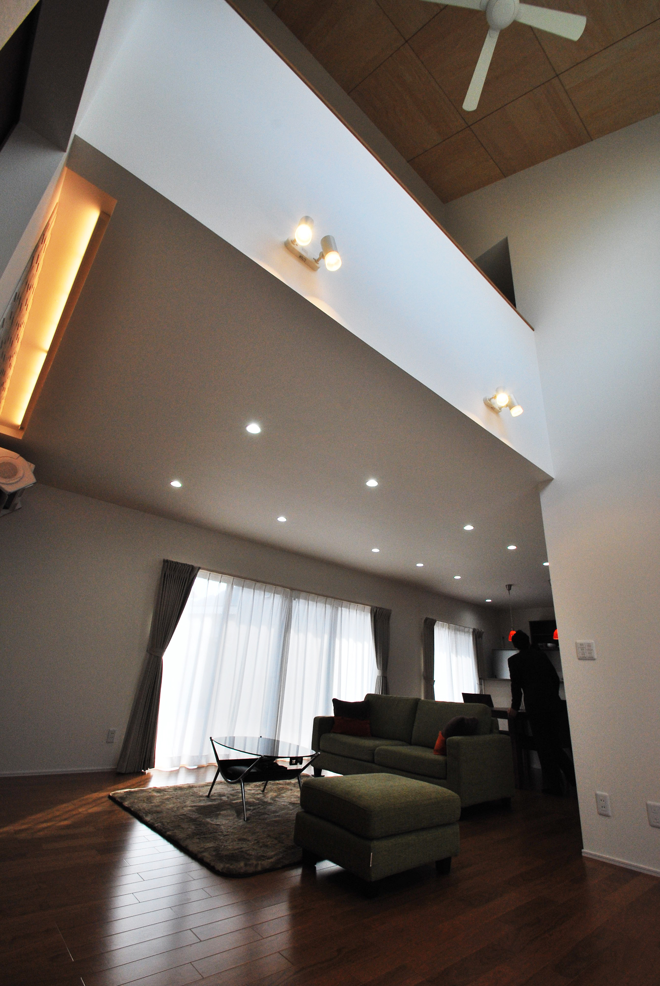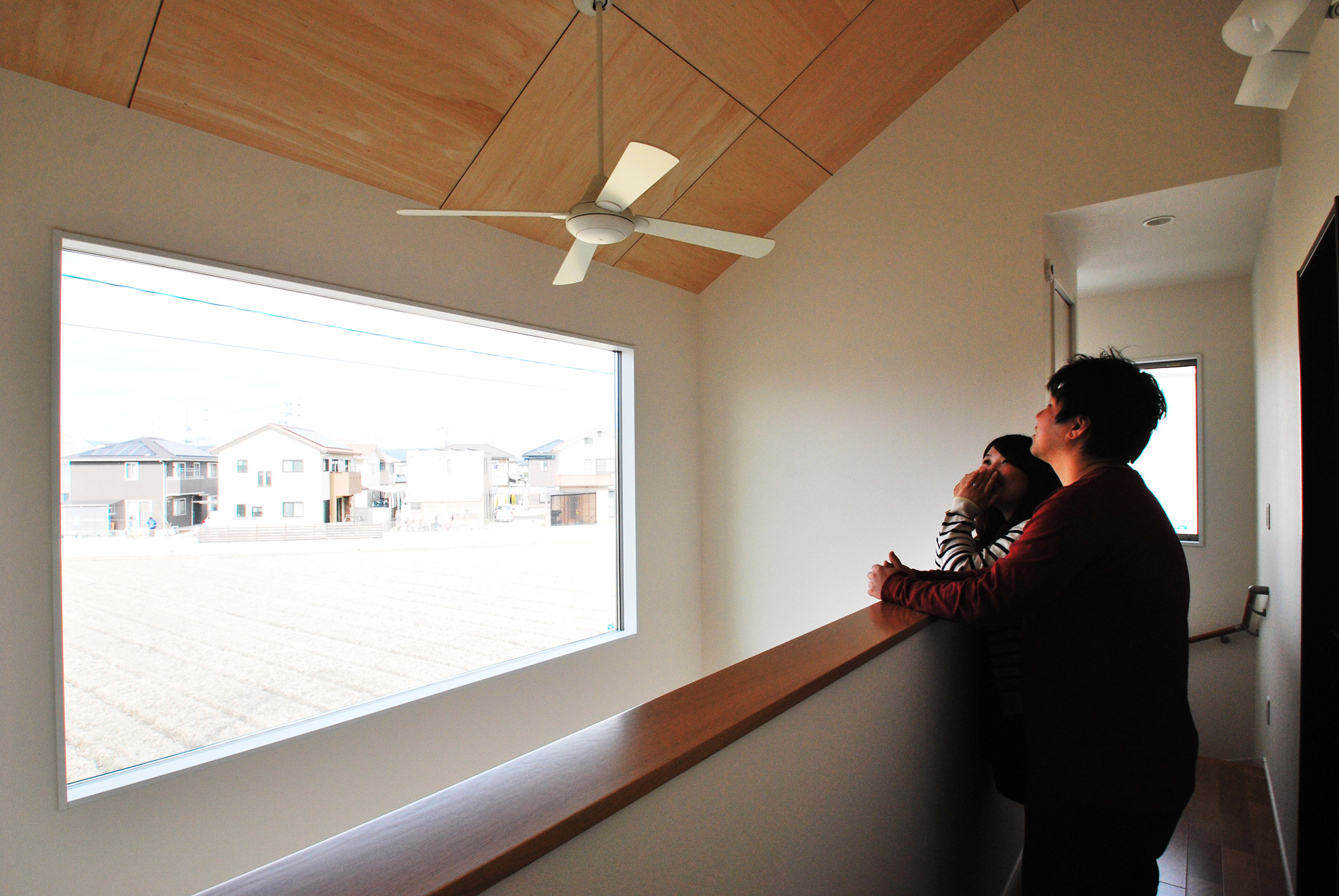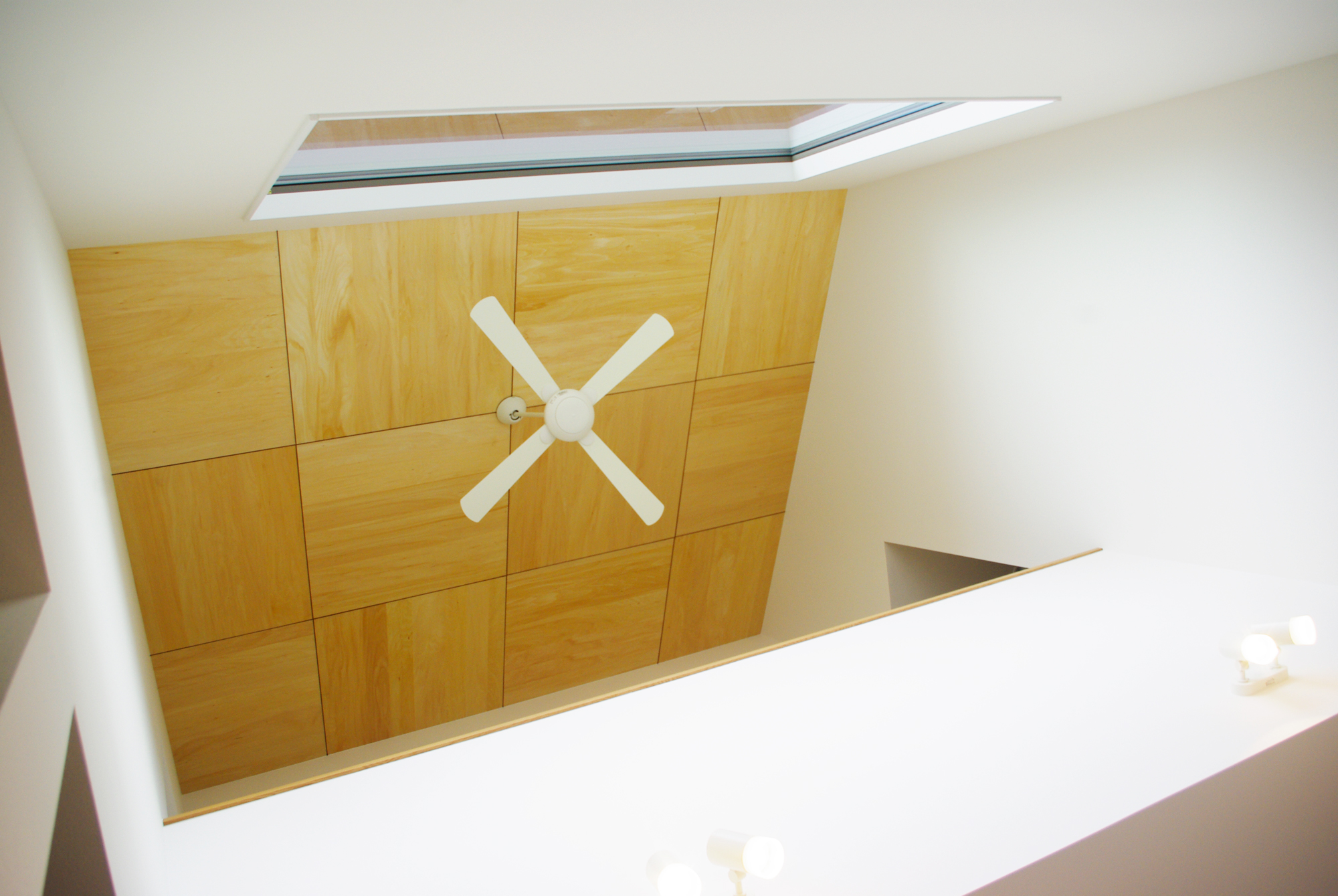 吹抜け勾配部分にはシナベニアを貼り一工夫。