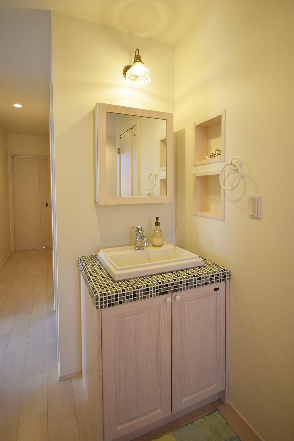 白い空間に淡いニッチの光が浮かび上がる玄関。