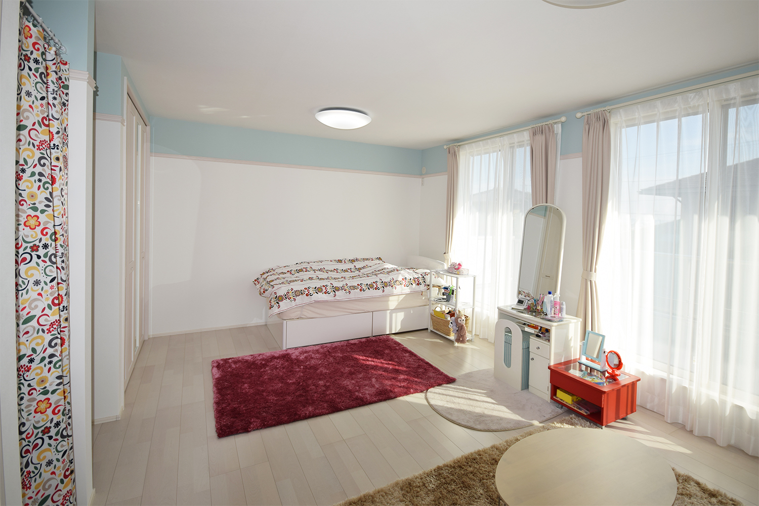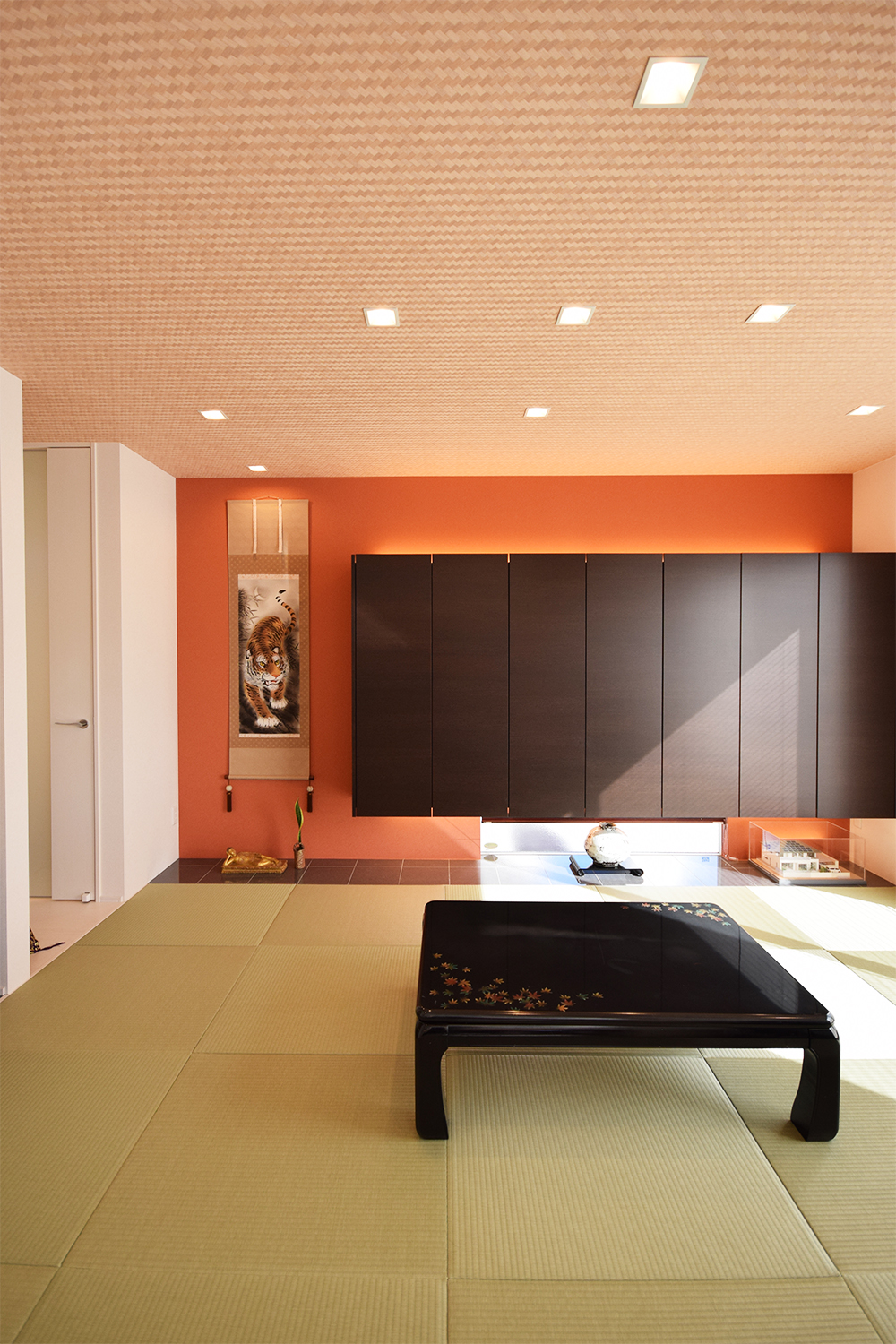 吊戸棚とカラークロスでモダンに仕上げた和室。このバランス、センスの良さを感じます。