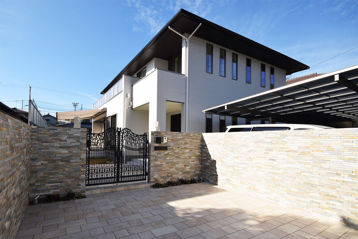 連続したスリット窓や大きく張り出した屋根が洗練されたモダンスタイルのH様邸。