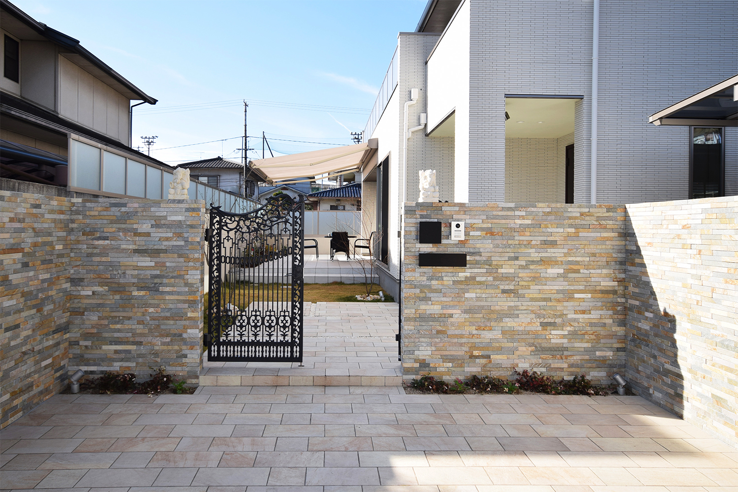 タイル使いクラシカルな門扉との組み合わせが格調高い雰囲気をかもしだしています。