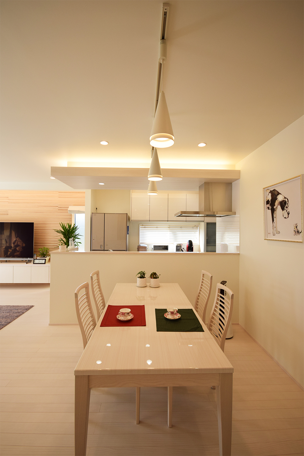 タイルや木など、様々な表情をもつ白のテスチャーを重ねた表情豊かなLDK。