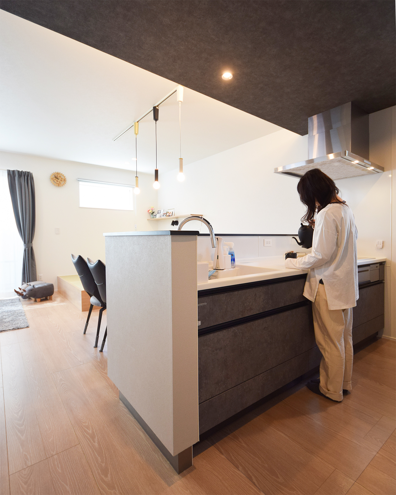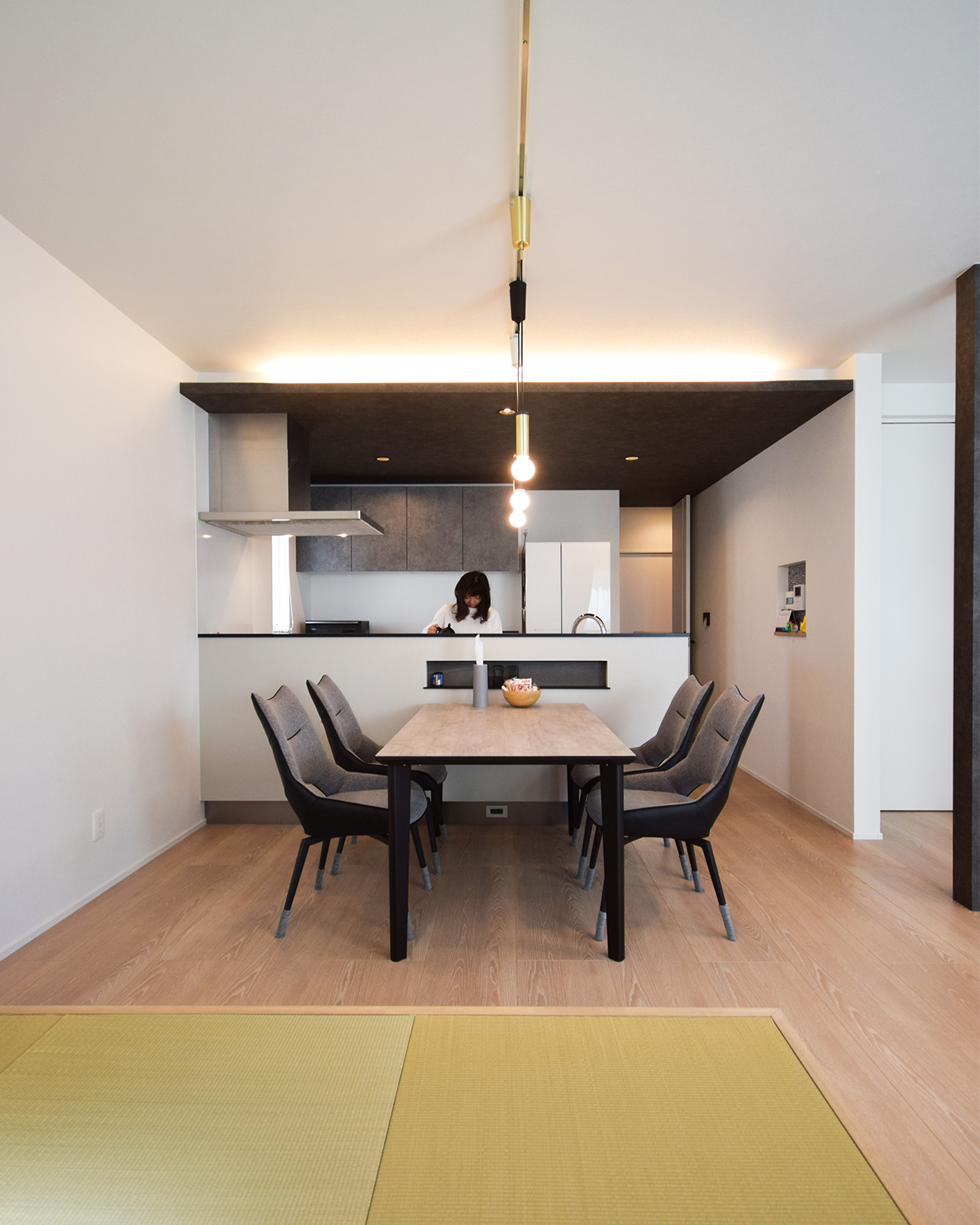 キッチンの天井には下げ天井&間接照明を取り入れて