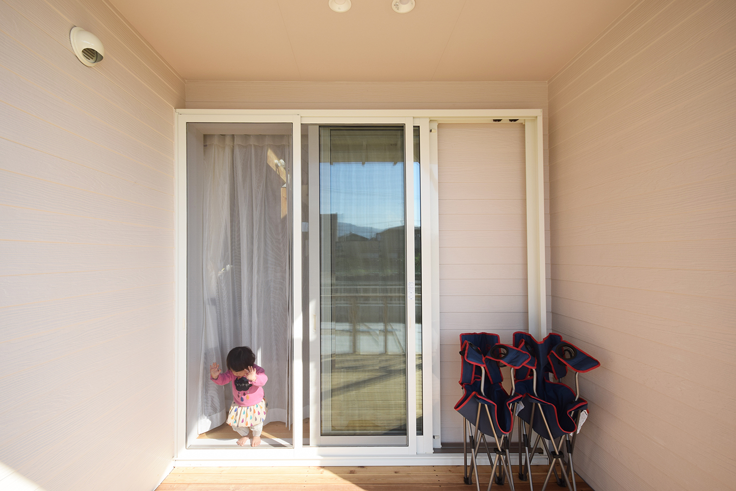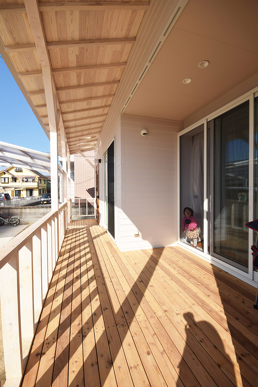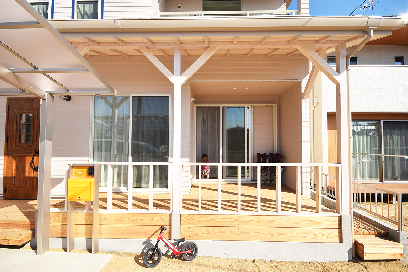 玄関ポーチ兼テラスはウッドデッキになっており、