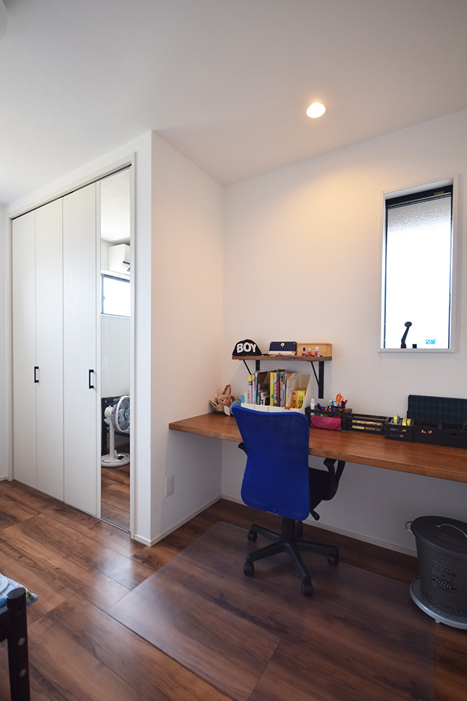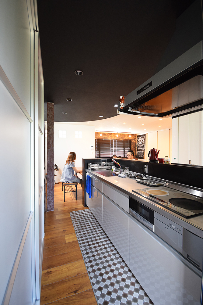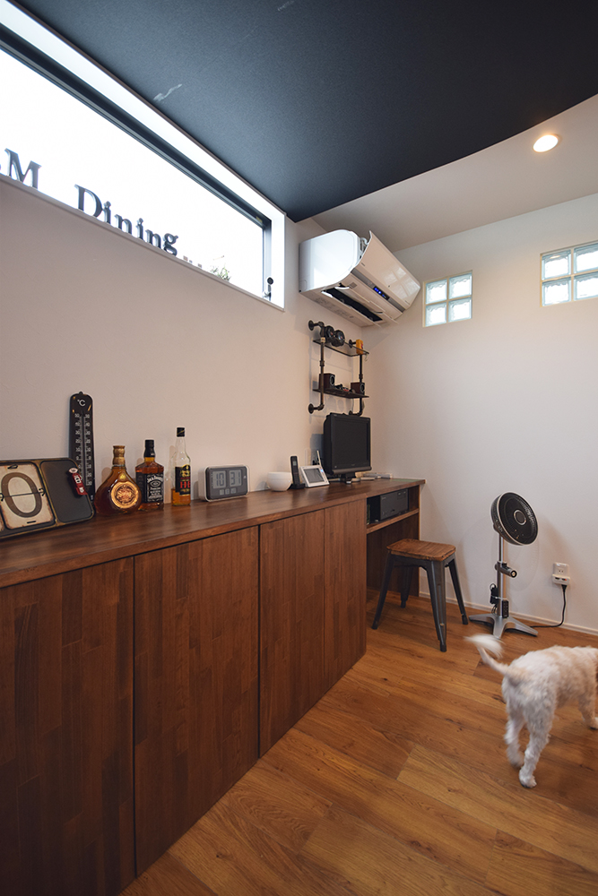 “また愛犬と暮らす家”をもう一つのテーマにしているS様邸は、床材にフロアタイルを使用する事で傷をつきにくくする工夫に加え、エコカラットをキッチンの腰壁へ施す事でいつでも気持ちの良い空気で生活できるよう設計されています。