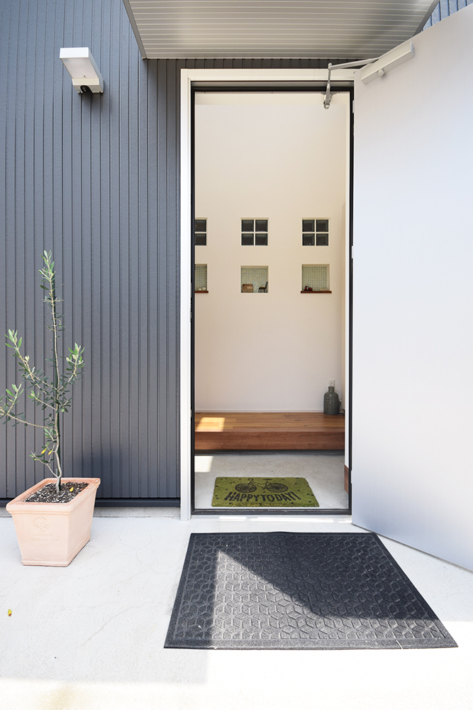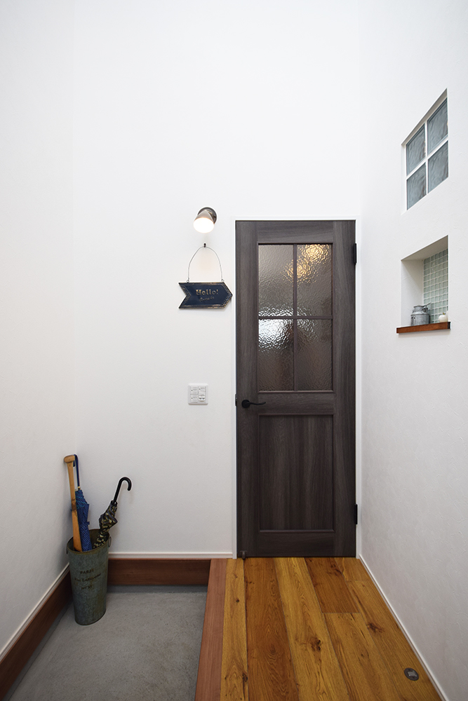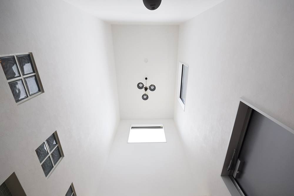 シンプルなドアを開けると吹抜けから光がたくさん差し込む明るい玄関が広がります。