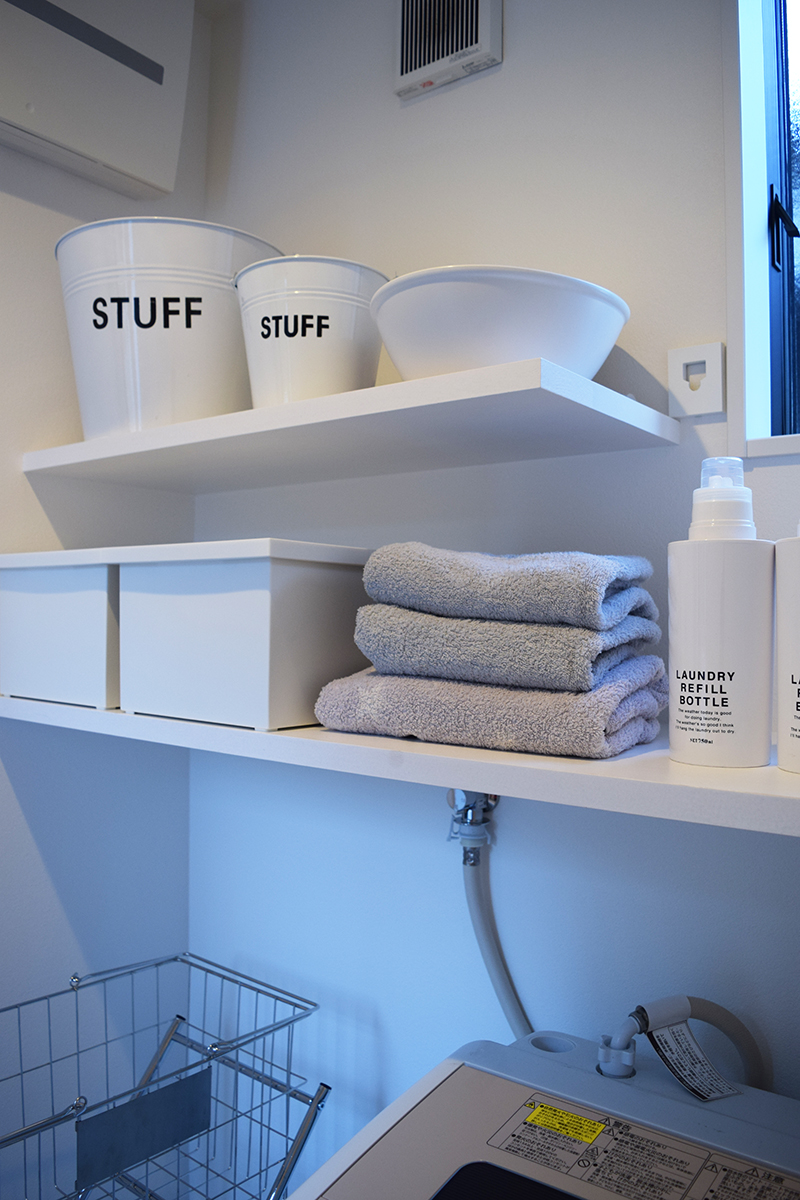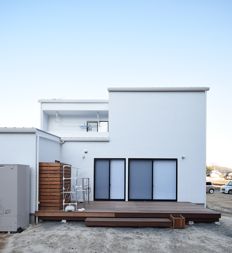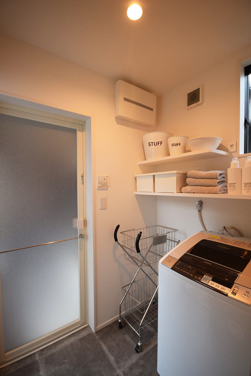 シンプルに白でまとめながらもグレーの塗り壁と木目でアクセントをプラス。