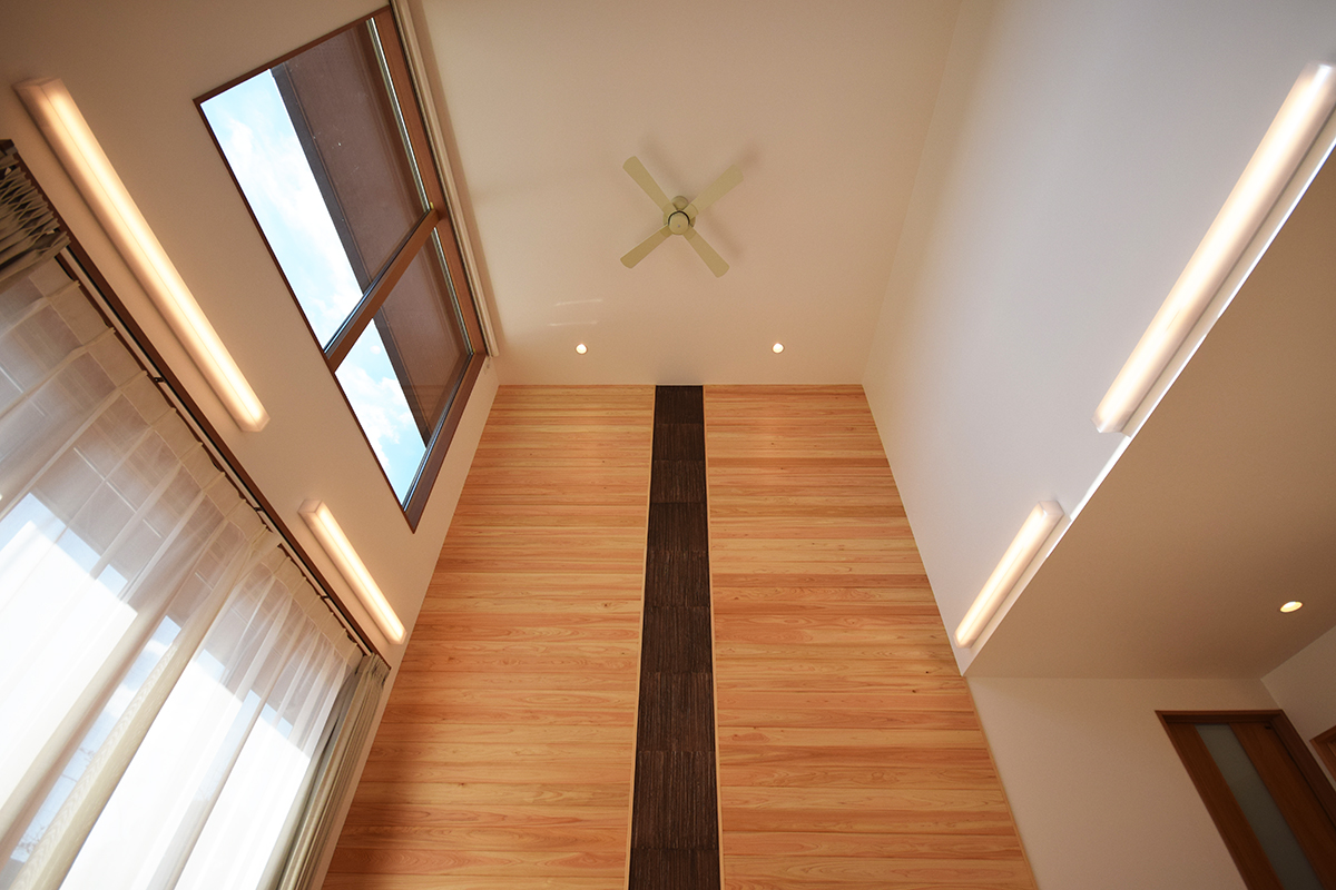 28畳のLDKは、大きな吹抜けと大きな窓から光が差込む明るく開放的な空間です。