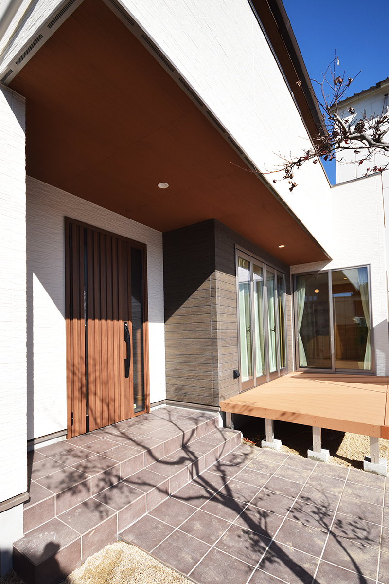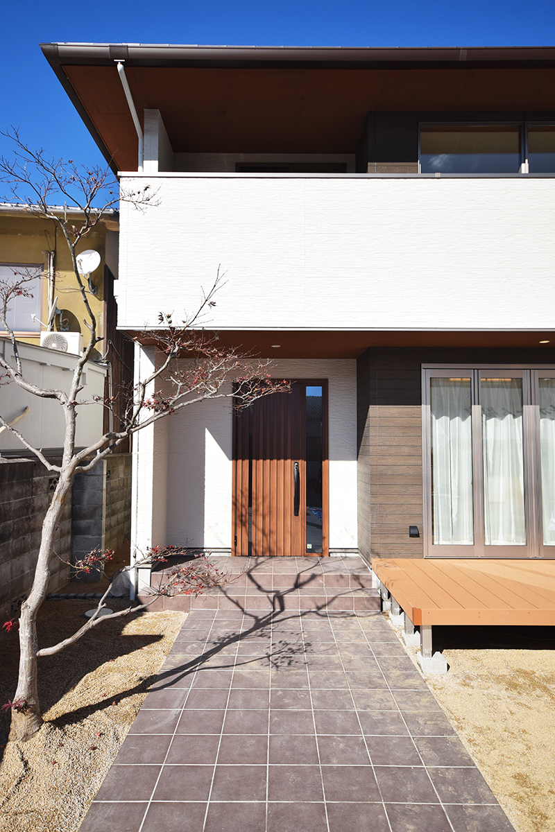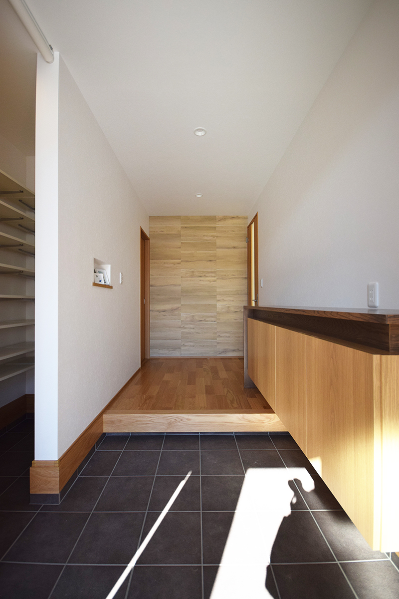 アプローチから玄関へ入るとホール正面の壁へデザイン性も兼ね備えたエコカラットを使用しました。