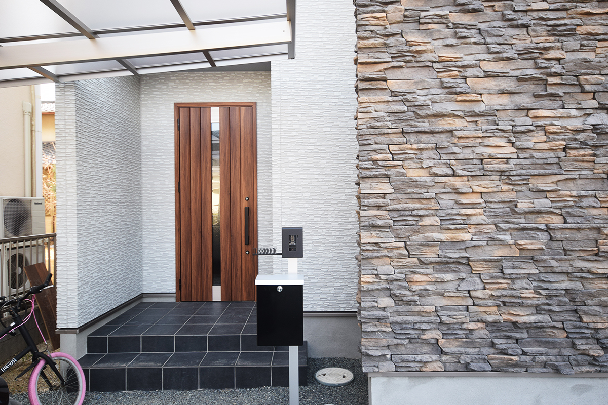 白を貴重とした外観にアクセントでタイルを施工しました。