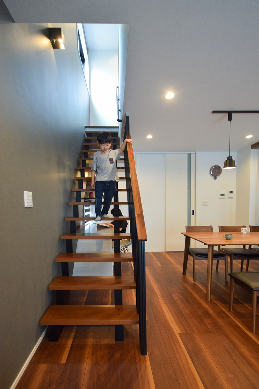 黒のアイアン階段で室内に開放感をプラスし、