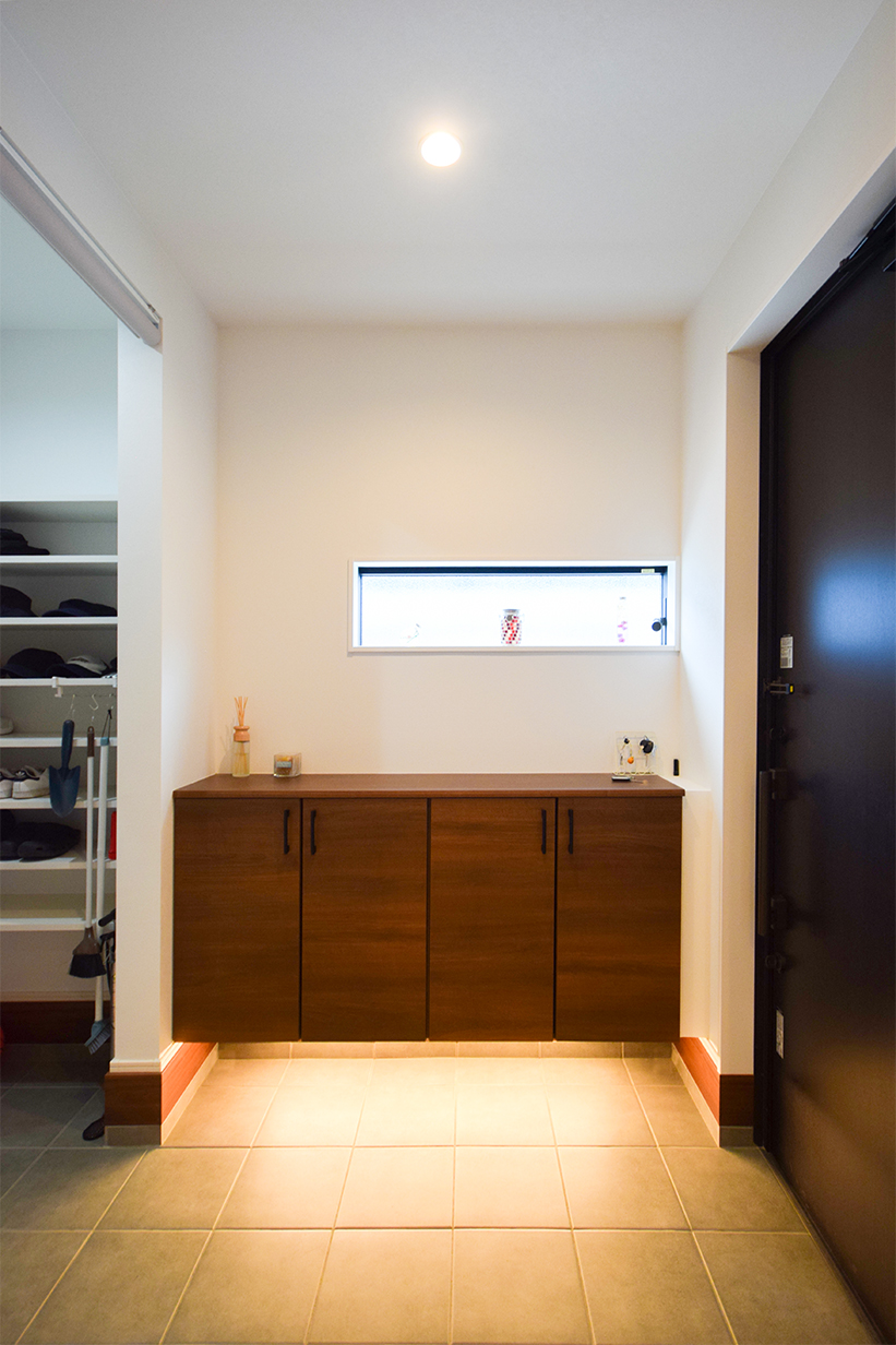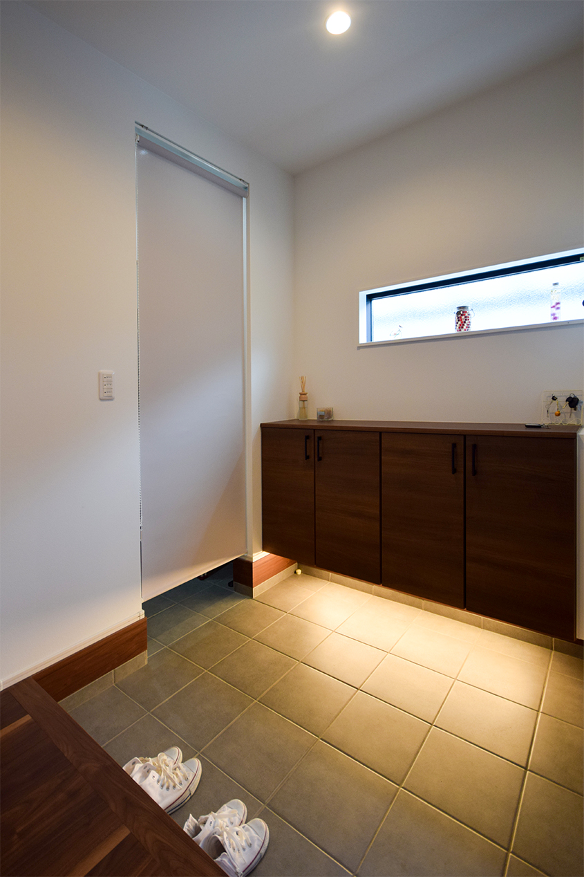 足元を照らす間接照明で雰囲気のある玄関ホール。