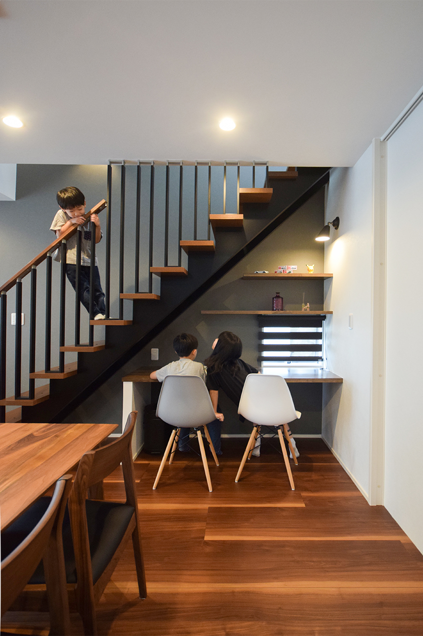 階段下にはカウンターを設け、PC作業やお勉強ができる