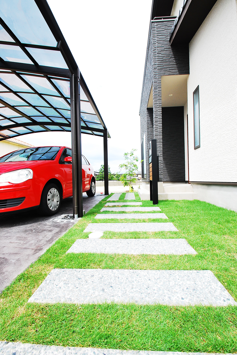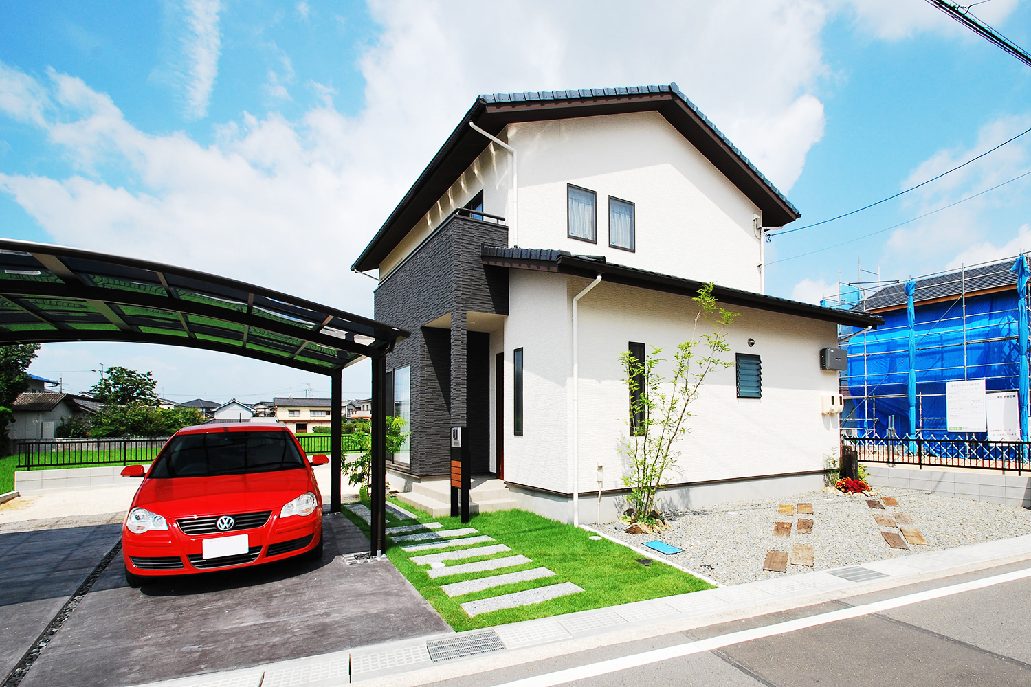 切妻屋根に白い壁のシンプルで落ち着きのある外観に、緑の芝生が鮮やかに映える。