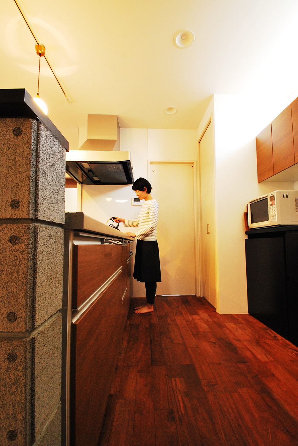 ブロックを腰壁へ使用した明るい対面式キッチンで、料理の腕を振るう奥様。