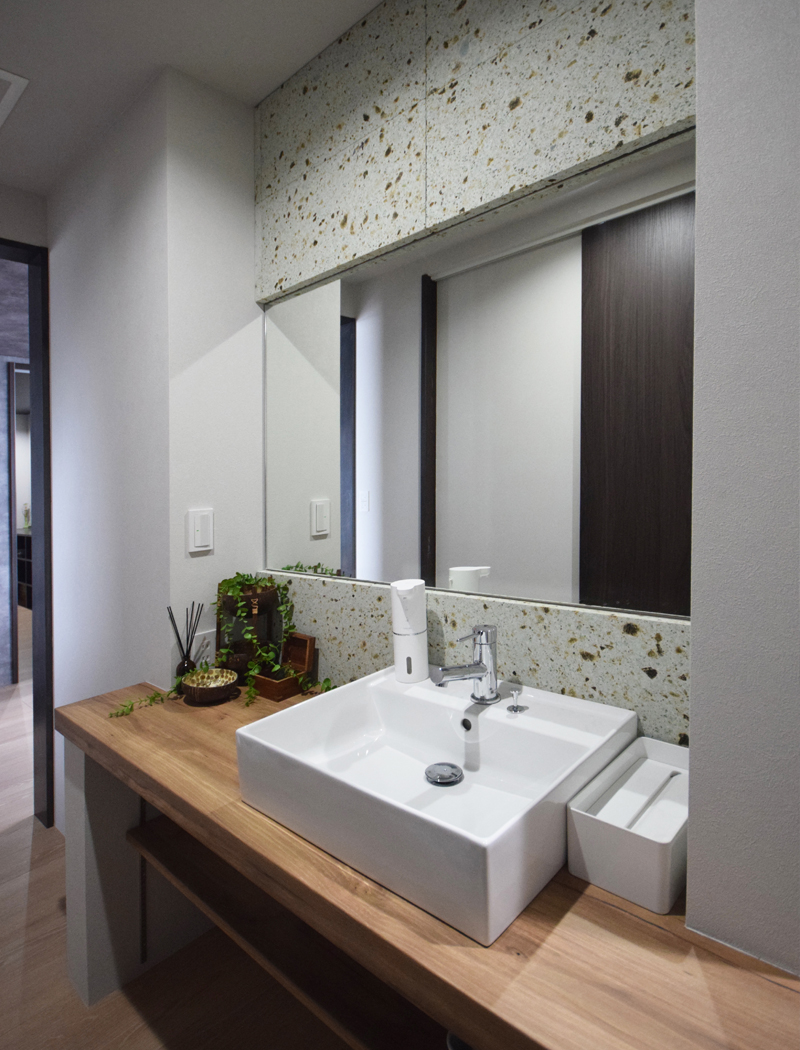 洗面スペースにはオーダーメイドの洗面化粧台を造りました!