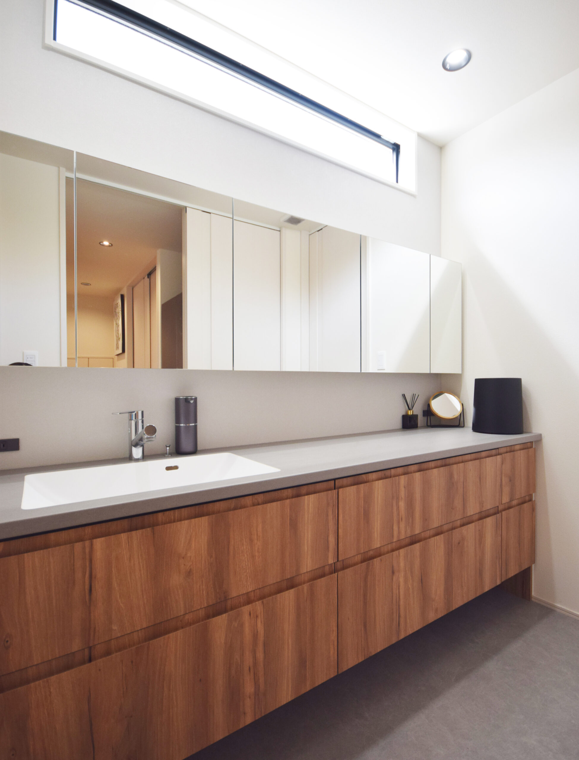 幅の広い造作洗面で朝の忙しい時間もスムーズに!