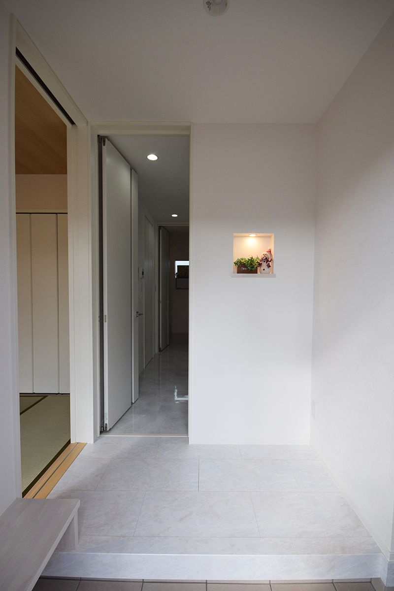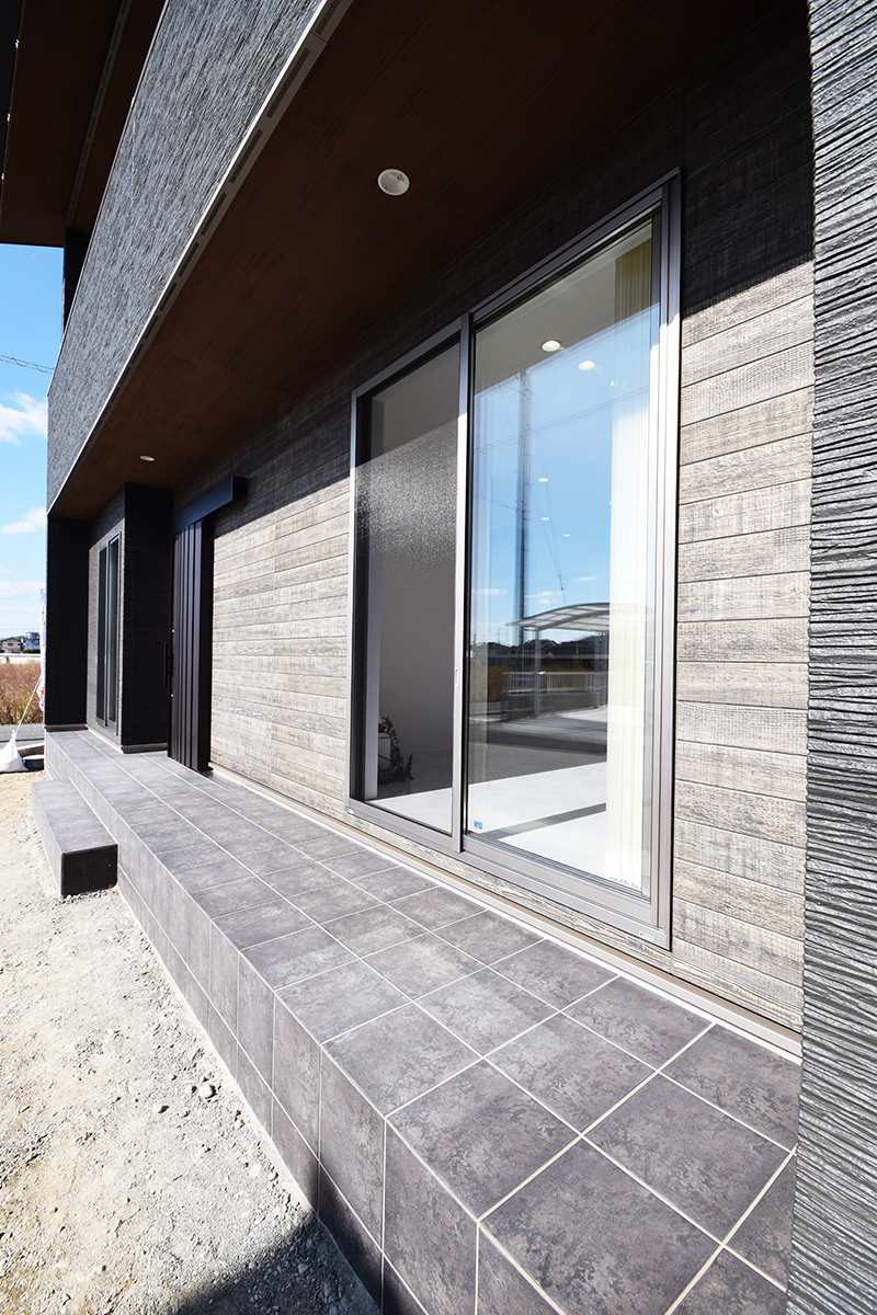 玄関前は広いタイルテラスで一休みできます。