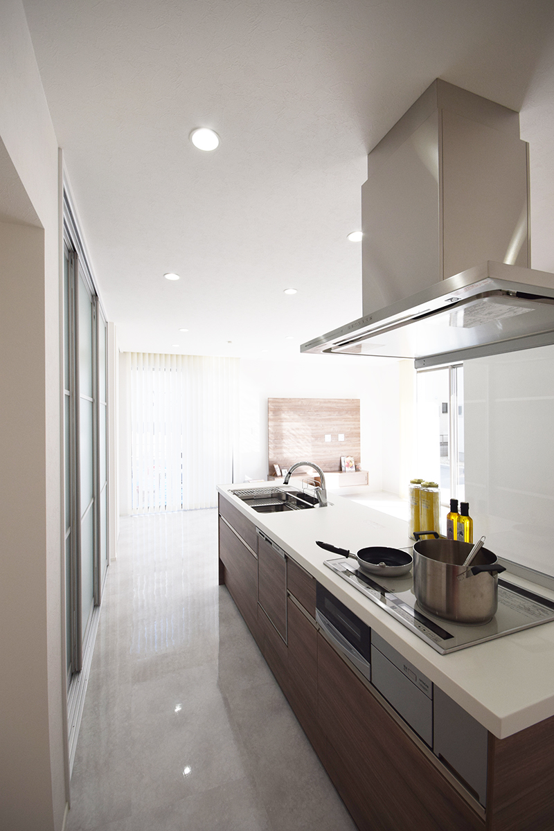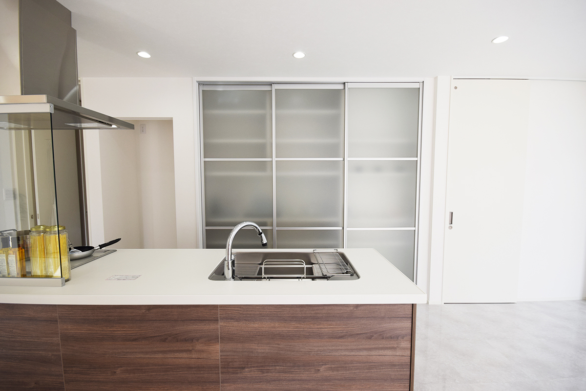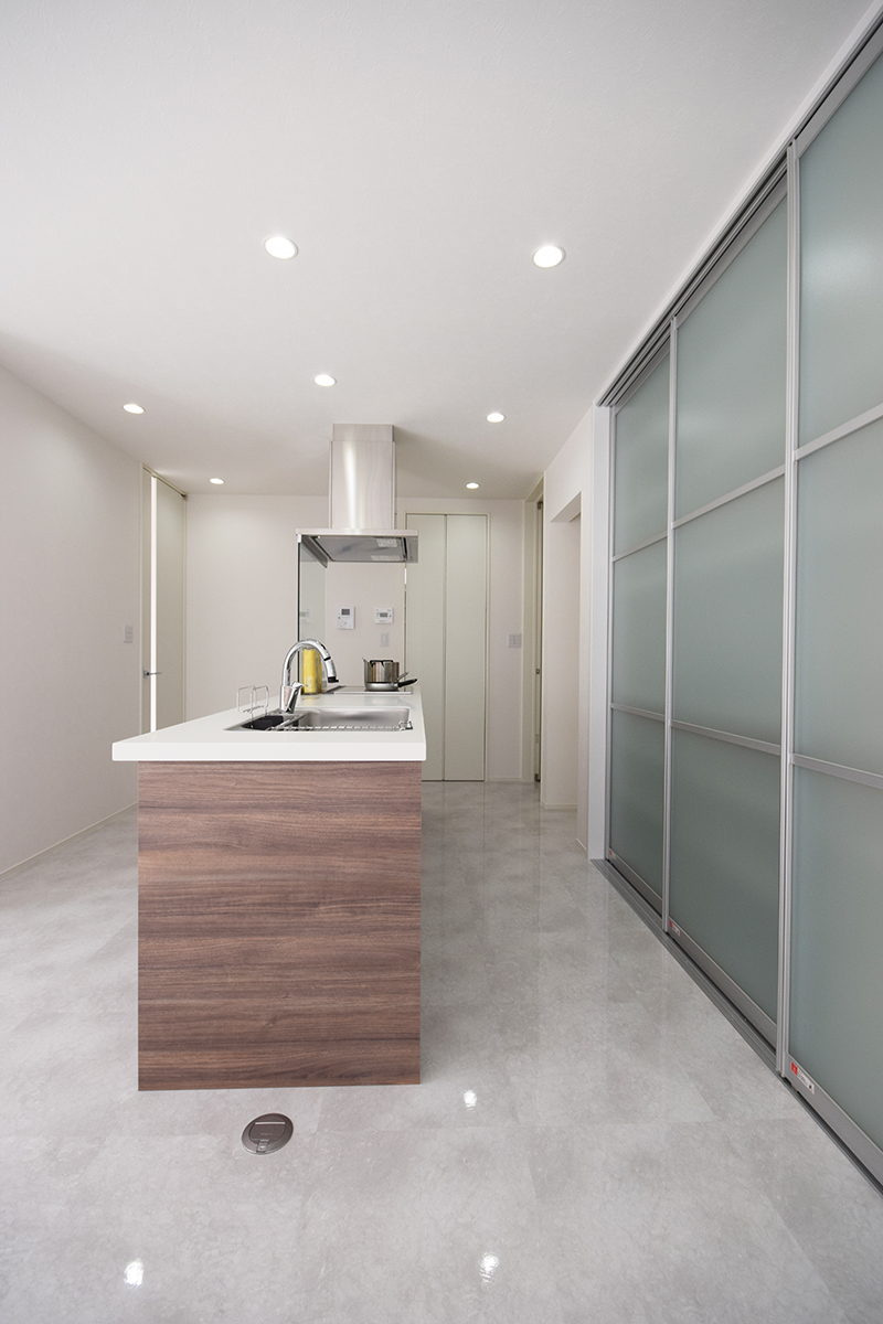 約16畳あるLDKは床へフロアタイルを施工しアイランドキッチンでスタイリッシュに。