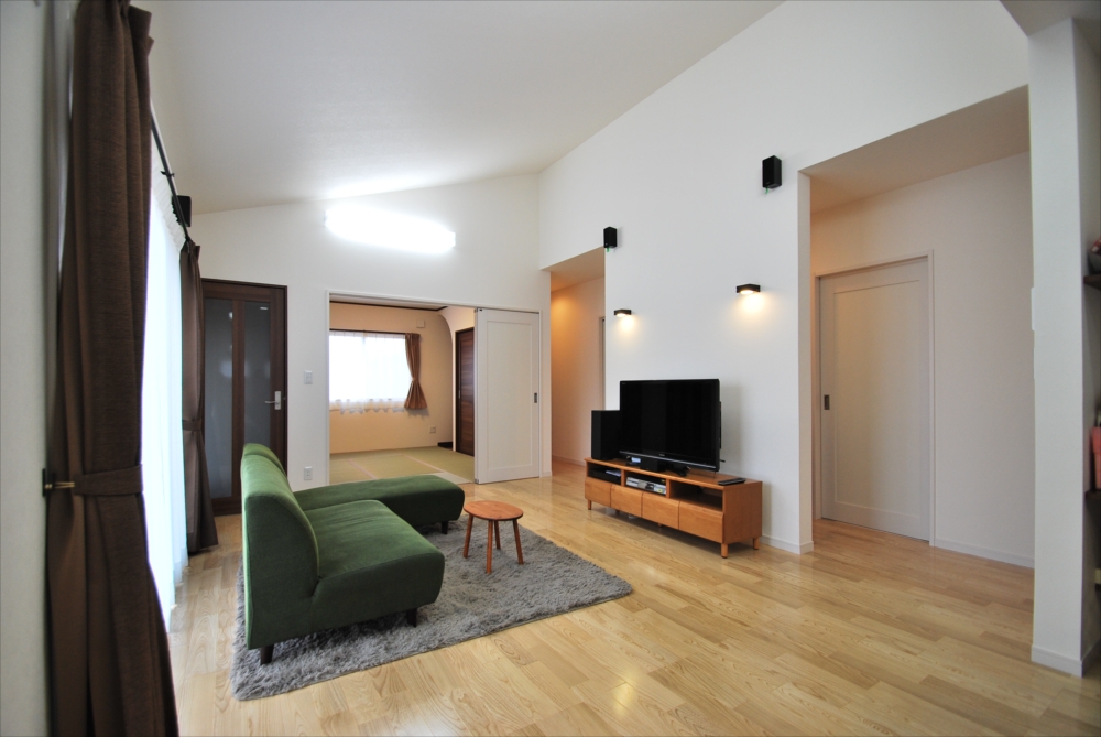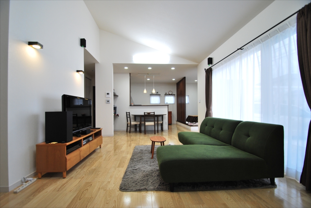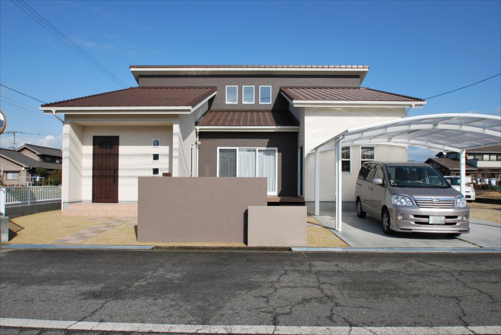 平屋をイメージした外観は あえて屋根を見せることで重厚感を演出。 ☆見学会を開催させて頂きました邸宅です。 外観はブラウンとホワイトのシックな外壁とシンメトリーにこだわり、 よりモダンで高級感のあるたたずまいに仕上げました。 LDKを勾配天井にすることで開放的でより広い空間に演出。 家具もあえて背の高くないもので揃え、 モスグリーンのソファーがナチュラルな空間を引き締めます。 LDK キッチン LDK 外観 共有:クリックして Twitter で共有 (新しいウィンドウで開きます)Facebook で共有するにはクリックしてください (新しいウィンドウで開きます) 関連