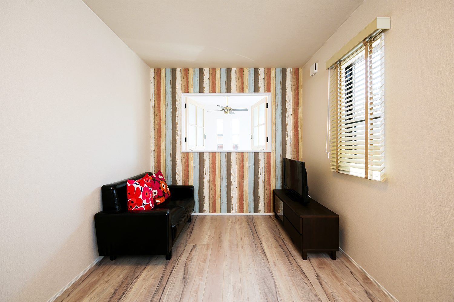 吹き抜けに面した2階の寝室は、アクセントクロスで遊び心をプラス。